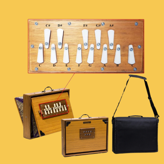 Construção A Shruti Box gera um som potente e sustentado, sendo extremamente fácil de tocar. É ideal para acompanhar música indiana, trabalho vocal, improvisação, canto de harmônicos ou instrumentos de sopro indianos, como a flauta bansuri. A produção de som é semelhante à de um harmônio ou acordeão: palhetas de metal vibram com o ar que passa por elas, controlado por dois foles em ambos os lados do instrumento. Um lado possui 13 palhetas; ao abrir uma, o ar flui e a palheta correspondente emite uma nota. A Shruti Box cobre um oitavo completo de 13 semitons cromáticos, permitindo escolher livremente o tom que melhor atende às suas necessidades. Para um som particularmente rico e pleno, recomenda-se adicionar a quinta ou quarta inferior à tônica. Qualquer outra combinação também é possível. A vantagem da Shruti Box em relação ao harmônio: é menor, mais leve, mais barata, fácil de transportar e de tocar.