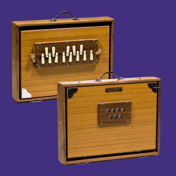 A Shruti Box Também conhecida como surpeti, a Shruti Box é ideal para música mundial, improvisação, trabalho vocal, canto de harmônicos, musicoterapia e diversos tipos de música indiana. Produz um som de sustentação completo e ressonante (“drone”) e é robusta, portátil e extremamente fácil de manusear. Para começar a tocar, destrave as travas de madeira dos foles em ambos os lados, abra as palhetas das notas desejadas e mova suavemente o fole para produzir o som.