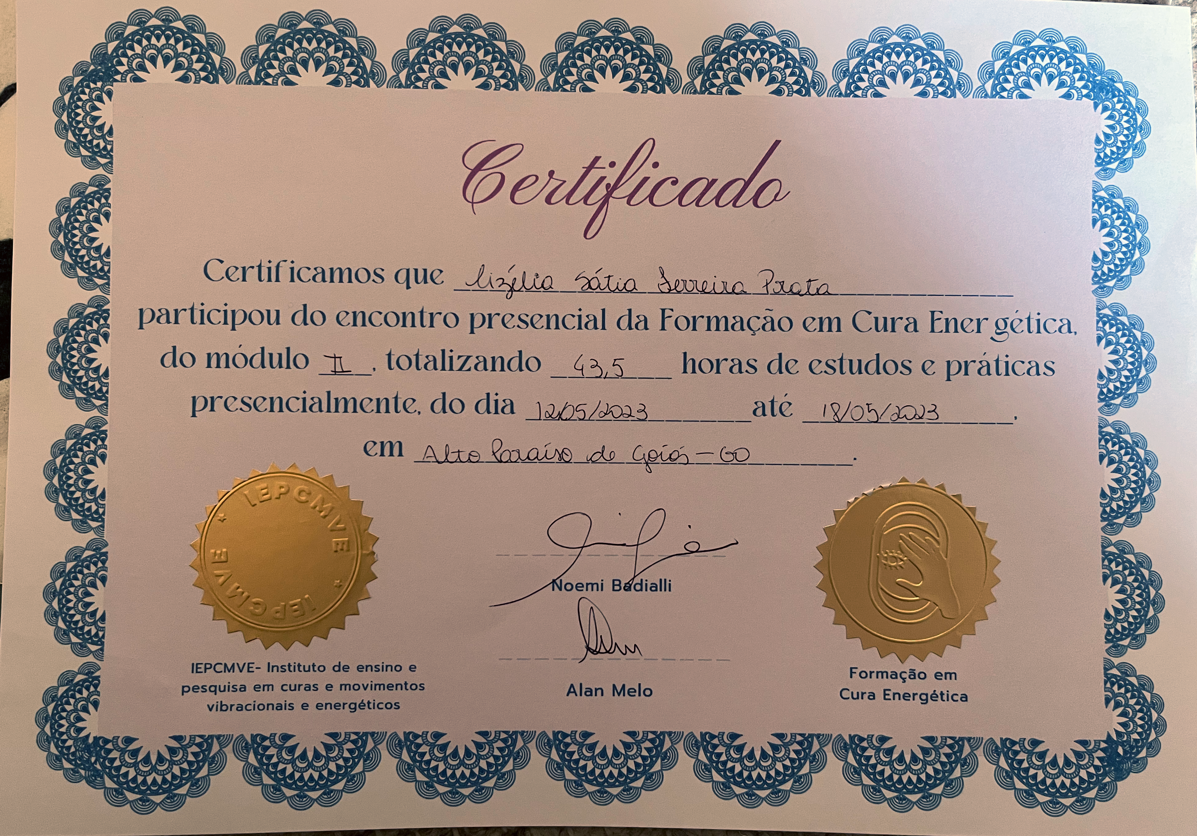 • Formação em Cura Energética – módulos 1, 2, 3 e 4 (2,5 anos, com práticas diárias)